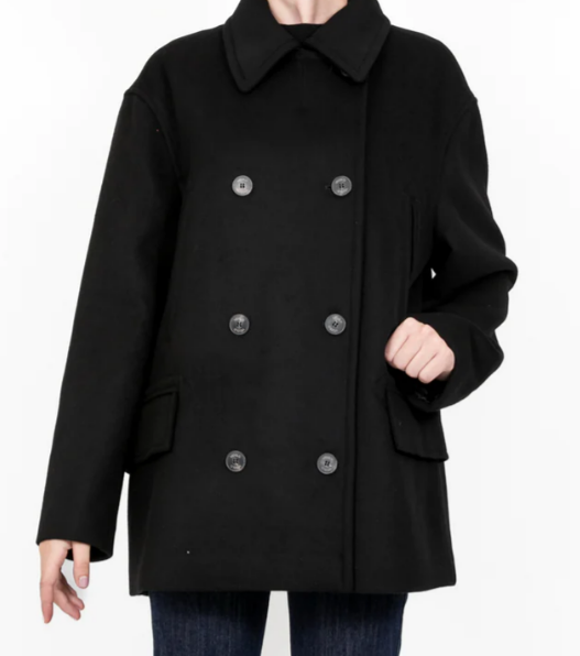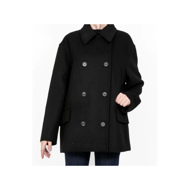 Cappotto misto lana doppiopetto con revers e maniche lunghe. Tasche frontali con patta. Chiusura frontale tre bottoni.