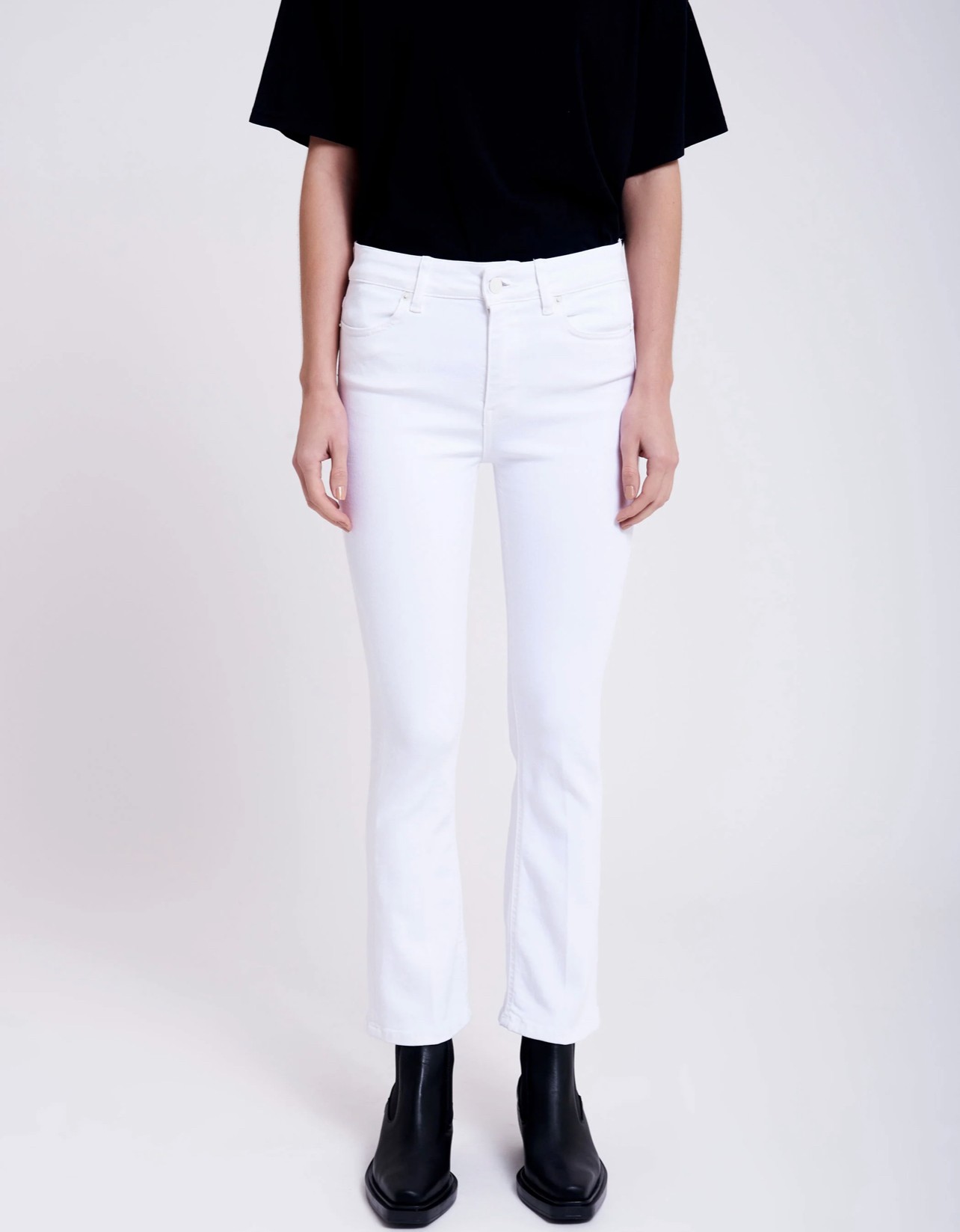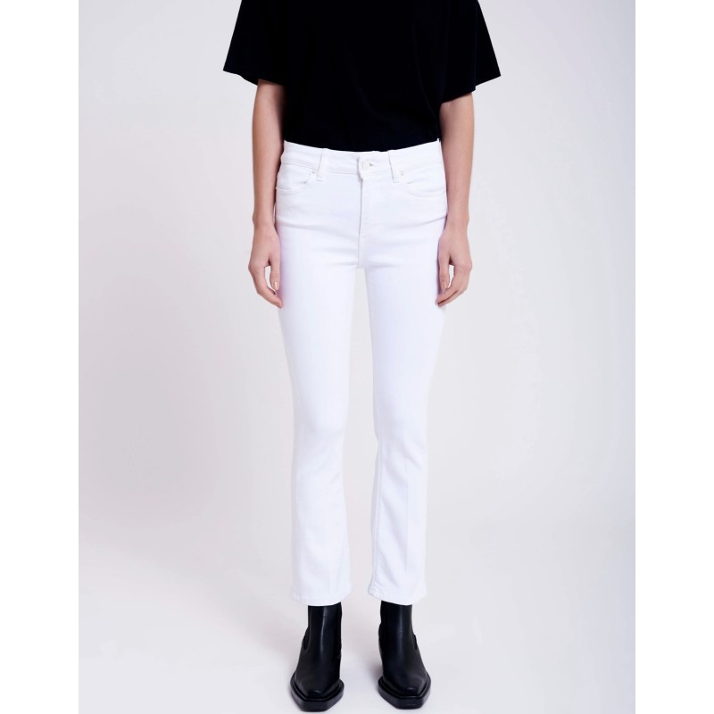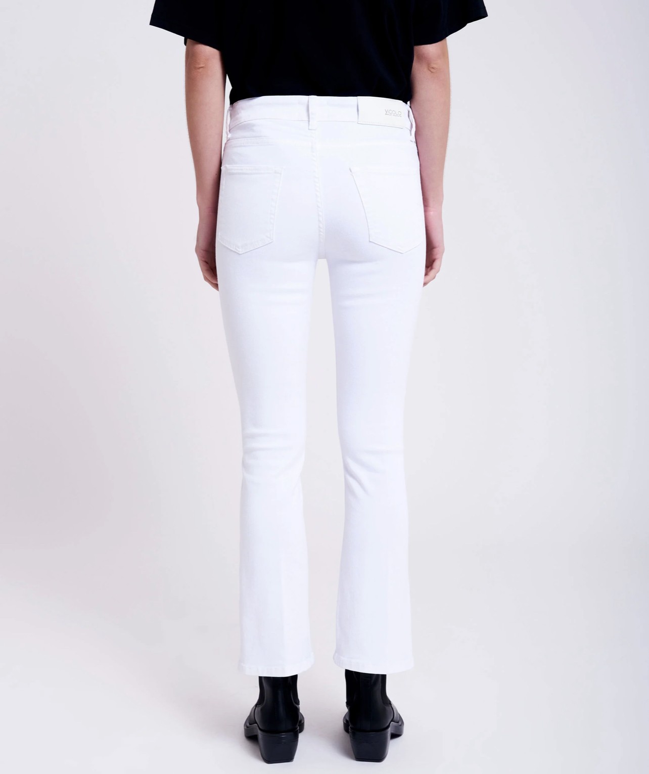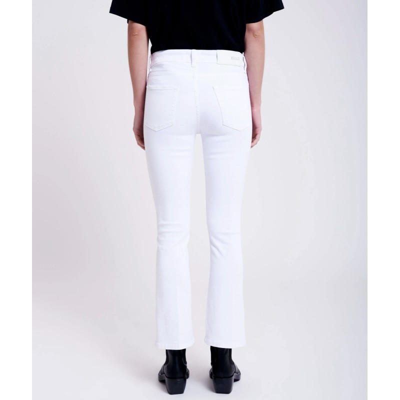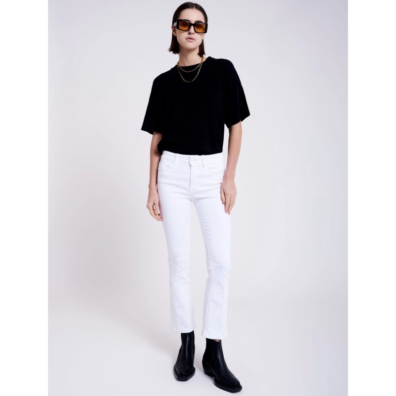 Jeans a vita media con fondo a zampa. Modello cropped. Modello cinque tasche. Chiusura frontale con zip e bottone.