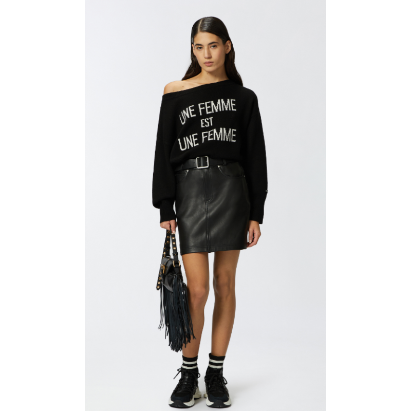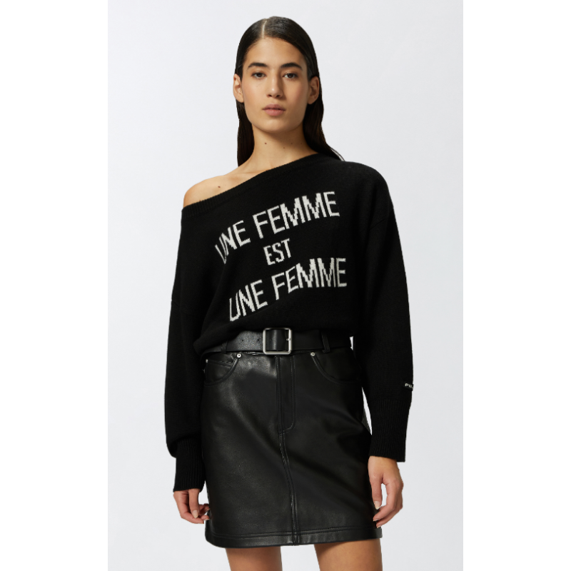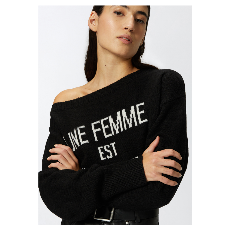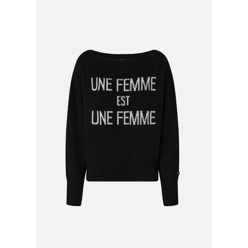 Pullover da giorno realizzato in morbida maglia 100% lana personalizzato con intarsio scritta "Une Femme est Une Femme", a contrasto di colore. Il maglioncino con scollo a barchetta, polsini e fondo capo rifiniti con lavorazione a costine, aggiunge un tocco di personalità ai tuoi look quotidiani.