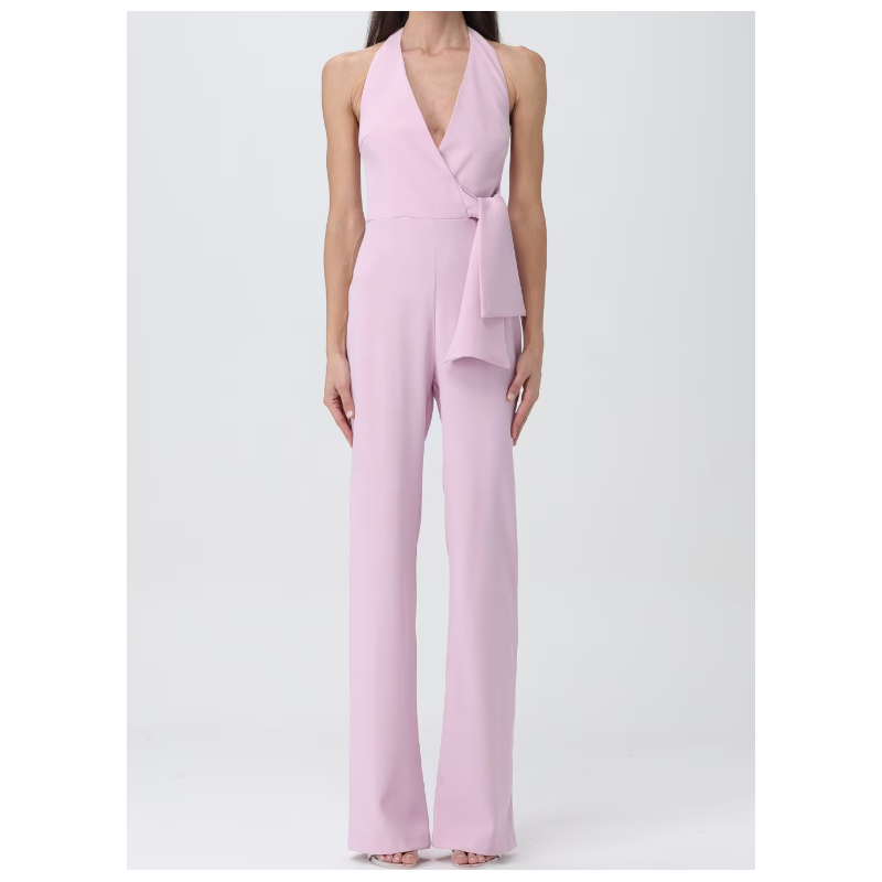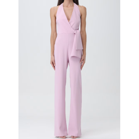 Tuta lunga senza maniche in tessuto crêpe stretch. Scollo all'americana allacciato sul retro del collo, con schiena scoperta e dettaglio incrociato davanti, completato da fusciacca da annodare su un fianco. Pantaloni a vita alta dalla linea aderente, svasata a fondo gamba. Chiusura con zip invisibile nel centro dietro.